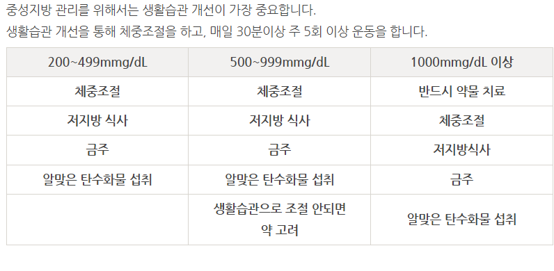 중성지방 수치가 높아지는 것은 잘못된 생활습관에서 기인하는 경우가 많습니다. 그럼에도 불구하고 증상이 명확하지 않아 자칫 간과하기 쉽습니다. 정기적인 건강검진을 통해 중성지방 수치를 확인하고, 올바른 식습관과 꾸준한 운동으로 중성지방 수치를 관리하는 것이 매우 중요합니다. 건강한 생활습관은 중성지방뿐만 아니라 전반적인 건강을 개선하고 심혈관 질환과 같은 위험을 줄이는 데 큰 도움이 될 것입니다.