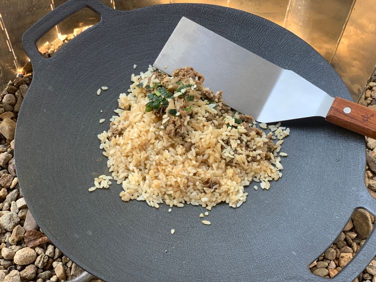 재료: 불고기용 고기, 양파, 대파, 밥, 간장, 참기름 조리 방법: 팬에 기름을 두르고 대파와 양파를 먼저 볶는다. 불고기용 고기를 넣고 잘 익을 때까지 볶는다. 밥을 넣고 간장과 참기름으로 간을 맞추며 볶아준다. 캠핑에서 빠질 수 없는 볶음밥! 미리 재료를 준비해 가면, 금방 한 끼를 해결할 수 있습니다.